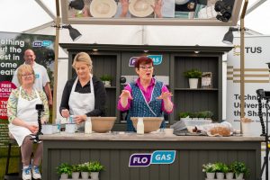 We went to the food village where we were scheduled to do our thing at 3pm. We did a pared down version of The Irish Soda Bread Way, one that suited the venue. We first chatted about how soda bread came to being in the mid 1800s. A lovely lady from the audience volunteered to bake white soda scones with Carmel. She had heard us interviewed on local radio, Midwest Radio the day before, as part of the promotion for Mayo Day, and wanted to join us. Our first groupie perhaps! Another lady then volunteered to bake traditional brown soda bread with us. It all went so well and the crowd seemed to enjoy themselves. The buttered and jammed scones just out of the oven were scoffed within minutes!